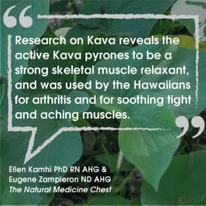 • Kava-Kava (Piper methysticum) is used in the South Pacific to relax the mind and body, achieve a tranquil state, and ease pain and anxiety, which often exacerbates pain. Research on Kava reveals the active Kava pyrones to be a strong skeletal muscle relaxant, and was used by the Hawaiians for arthritis and for soothing tight and aching muscles.