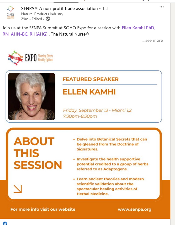 Join The Natural Nurse and many other experts in the 2024 SOHO Expo Education Program in Orlando Florida. FREE for SENPA members